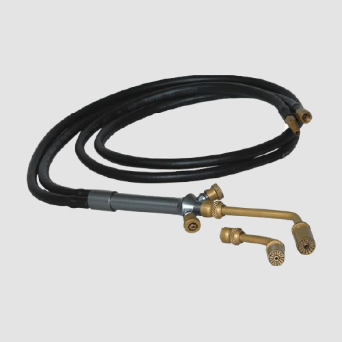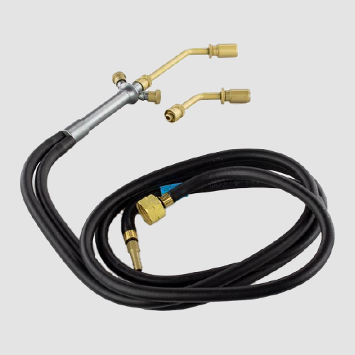 Incluye además dos boquillas patentadas por la marca, que proporcionan una llama concéntrica de excelente valor térmico. Las mangueras se conectan al cuerpo del soplete, incluyendo un terminal para aire de un cuarto con